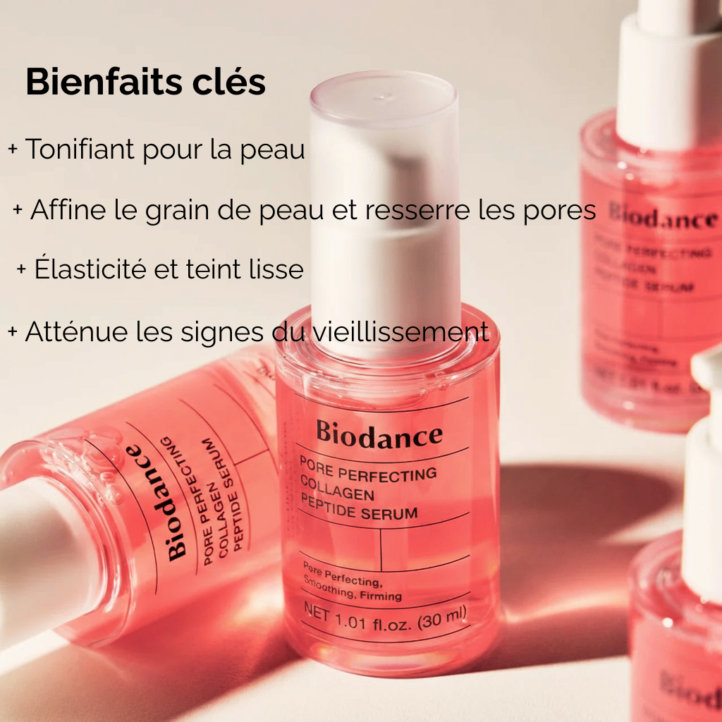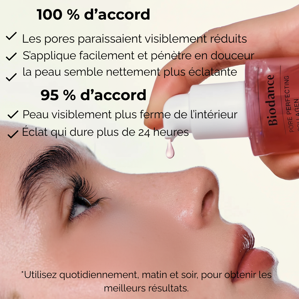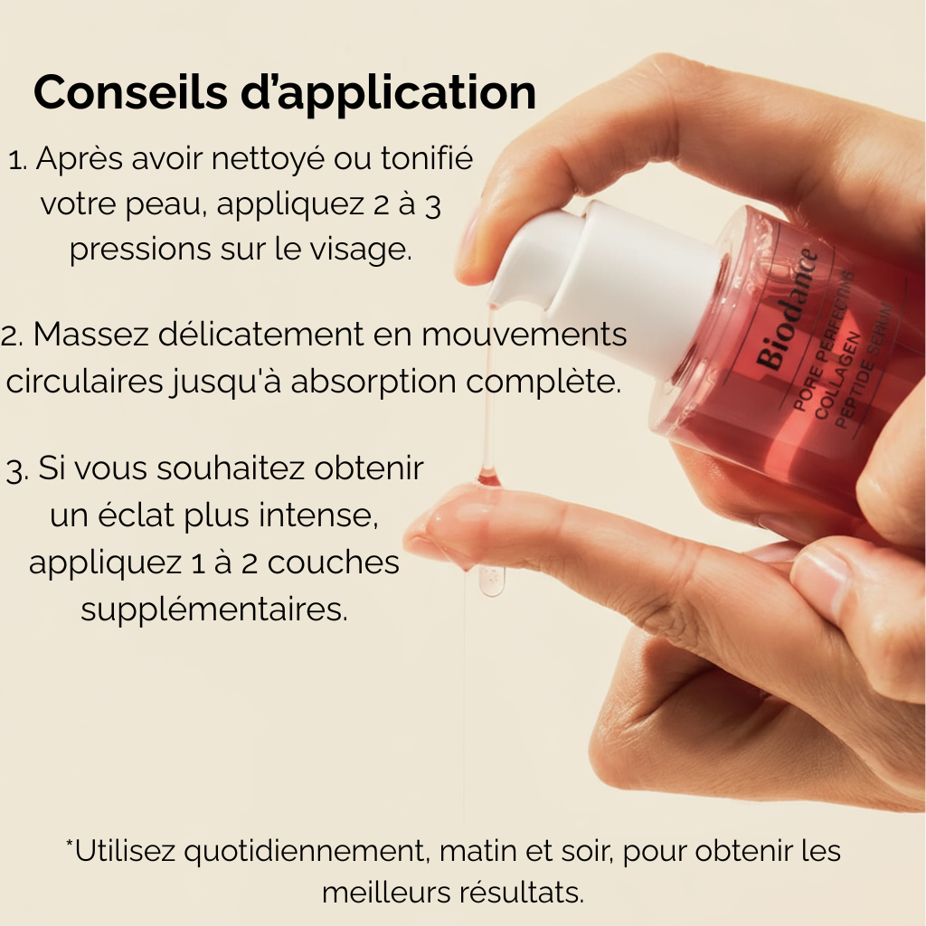 Grâce à ses 10 peptides et son eau de collagène brevetée, le sérum aide à réduire l’apparence des pores, lisser le grain de peau et apporter un éclat naturel. Les premières améliorations sont visibles après 1 à 2 semaines d’utilisation régulière.